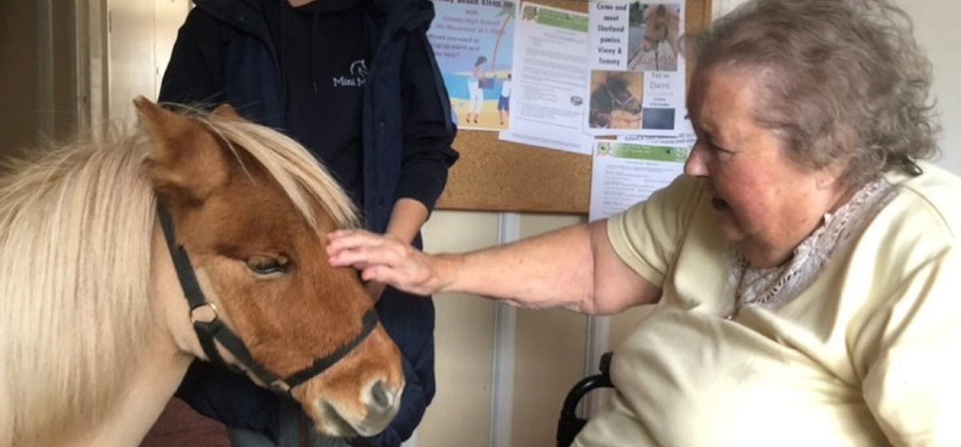 [Summary: Residents at The Tithebarn in Liverpool were delighted when two little therapy ponies came to visit. Residents were all smiles when Vinnie and Tommy, two beautiful miniature Shetland ponies, arrived at the Home.]