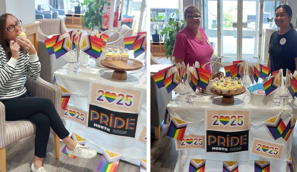 Left: Clinical Nurse Manager Louise celebrates Pride Month by tucking into a rainbow cupcake at RMBI Care Co. Home Connaught Court, in York. Right: Staff members Tracey and Jek celebrate Pride Month at RMBI Care Co. Home Connaught Court, in York.
