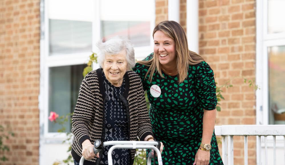 A female resident and a female staff member enjoy an outdoor afternoon stroll. They're both smiling. The resident wears a colourful dress, and the staff member wears a uniform.