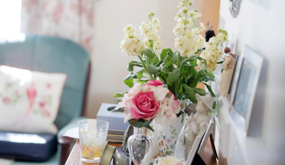 Indoor area at The Tithebarn Two female residents and a female staff member sit around a table adorned with colorful flowers, sharing smiles and conversation.